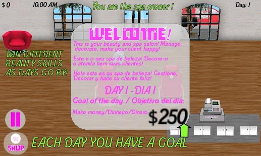 You are the owner of the salon. The clients want to look like barbie dolls in the end of your services. Everyday there is a goal (money you make) and for that you have to make your clients happy. You have to satisfy the client’s order expressed by the bubble above the client.